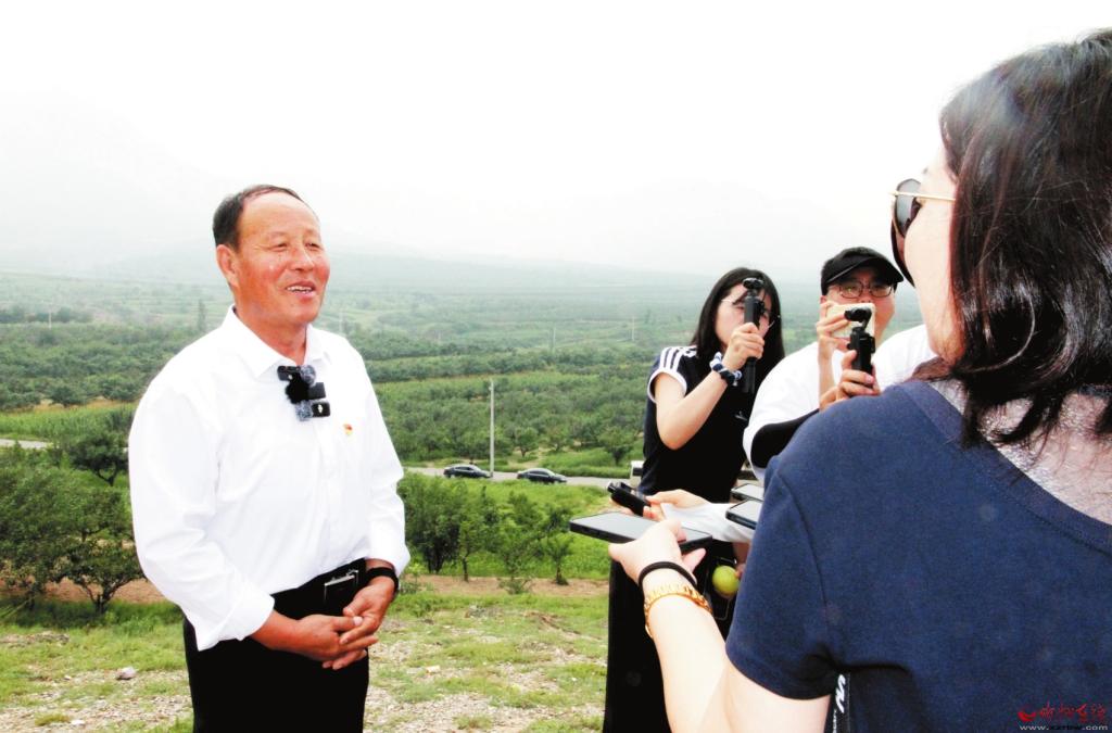 在萬畝玉露香酥梨基地觀景臺上,栗翠田(左一)接受“三晉人大代表采風行”記者采訪張林泉攝