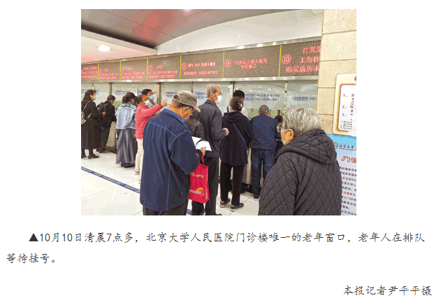 “趕緊地,再晚兩步,號兒就被人用手機(jī)搶光了!”10月10日早晨7點(diǎn),李玉蓉緊捯碎步,催促身后的老伴一起往北京大學(xué)人民醫(yī)院門診樓里沖。
