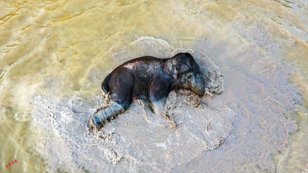 象群飽餐一頓,到了玩耍時間。它們轉到一個魚塘邊,幾頭野象滑到魚塘里“洗澡”,在水里不停翻滾,嚇得魚兒都跳出了水面。在岸上,有的野象把水桶踢著玩,還有的爭搶水管當玩具……