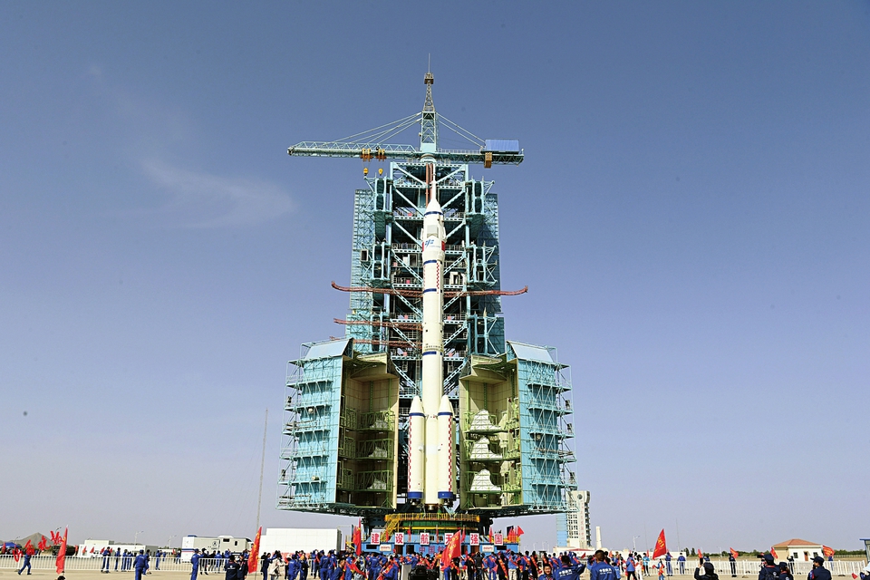 圖為5月22日,神舟十六號載人飛船與長征二號F遙十六運(yùn)載火箭組合體轉(zhuǎn)運(yùn)至發(fā)射塔架。