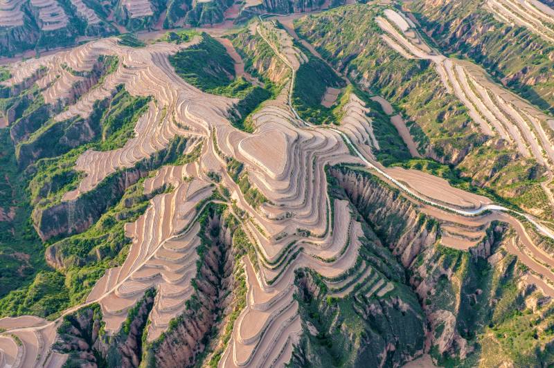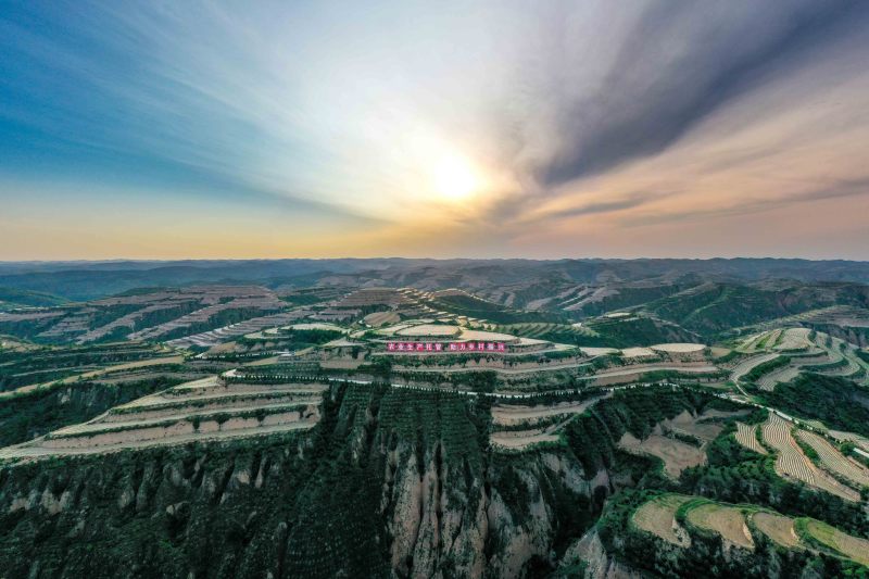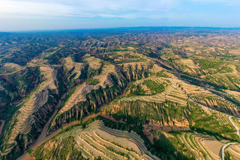 站在永和梯田觀景臺(tái)上,一壟壟地膜像一條條白色的絲帶,纏繞在層層疊疊的梯田間。連綿的山坡間、山塬上,鋪滿了綠色的盛裝——油松、連翹,還有地里的高粱苗,正孕育著無(wú)限的生機(jī)活力。