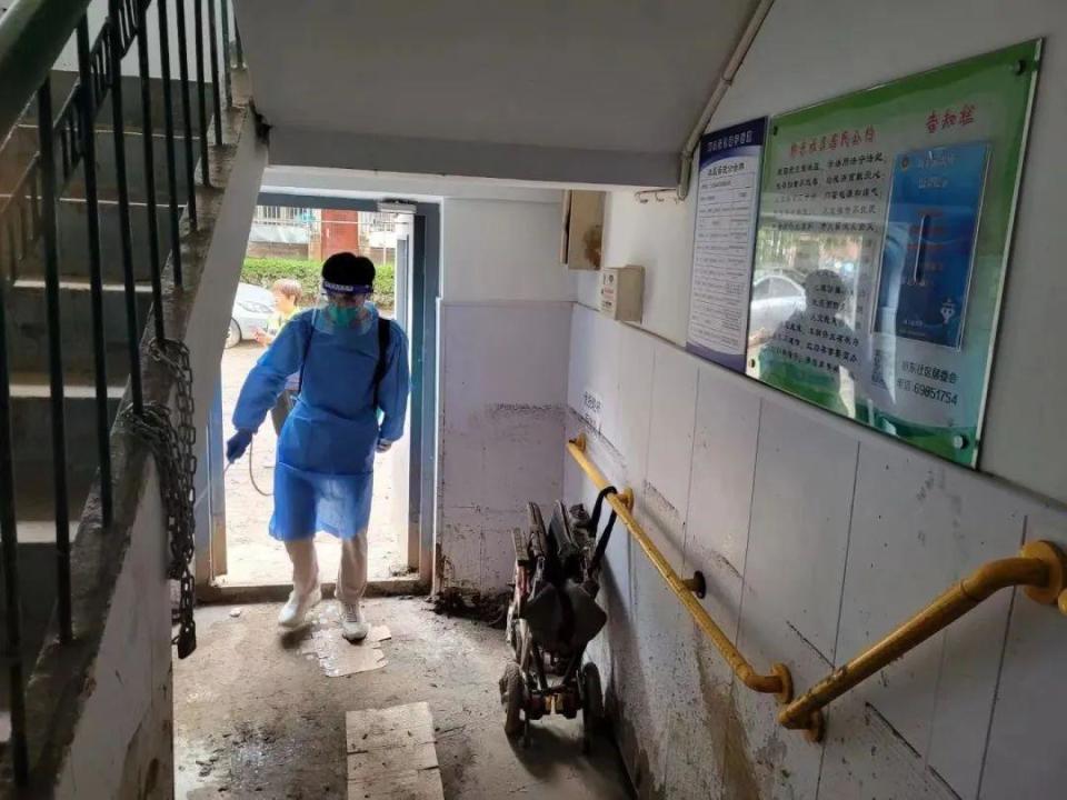 “益行志愿服務隊從8月4日17點下班后開始組織救災工作,到凌晨24點充分準備完畢。總計出動9輛汽車,志愿者們對社區(qū)內(nèi)的一樓單元門口、垃圾分類驛站、居民家里、黨群活動中心、居委會物資庫、社區(qū)花園內(nèi)和道路,開展清理淤泥和清洗路面工作。”張偉麗介紹道。