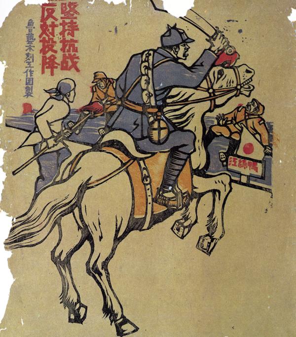 魯藝木刻工作團制作的新年畫《堅持抗戰(zhàn) 反對投降》。新華社發(fā)(延安魯藝文化中心供圖)
