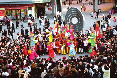 2月11日,孝義市時代天街人潮涌動,紅火熱鬧的背鐵棍等傳統(tǒng)民間表演吸引人們駐足觀看。