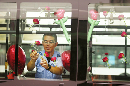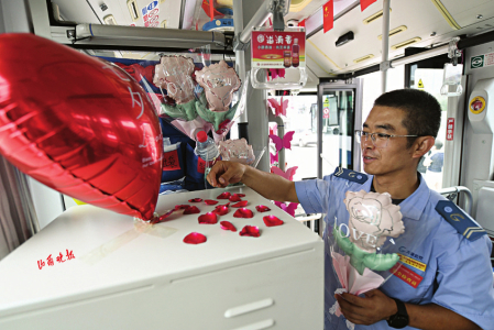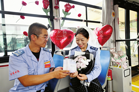 七夕節(jié)即將到來(lái),8月8日,在太原公交第三汽車分公司,公交車廂里上演了一場(chǎng)別樣的浪漫——堅(jiān)守在一線的兩名公交司機(jī)閻樹德和焦更新,分別為出車回來(lái)的妻子準(zhǔn)備了大大的驚喜。用送花、提前準(zhǔn)備飯菜、布置車廂等行動(dòng)表達(dá)自己的愛意。