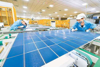 圖為安徽華晟新能源科技股份有限公司的異質結光伏電池及組件工廠內,技術人員在對產品進行檢測。徐 勇攝(新華社發(fā))