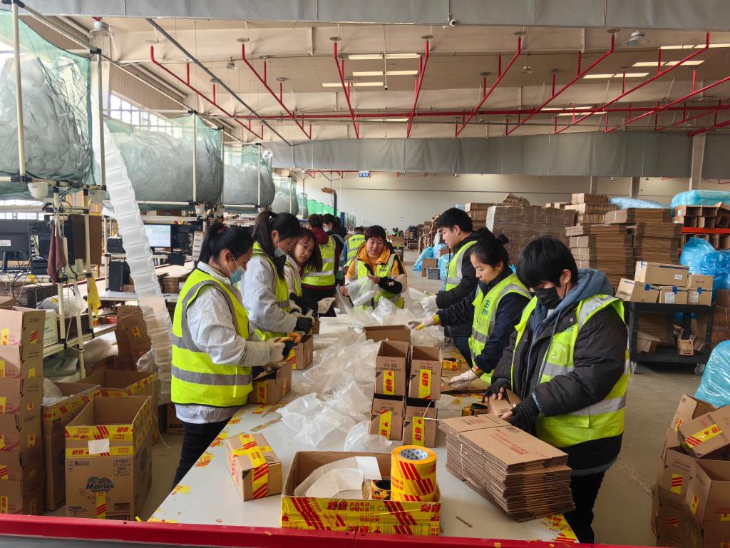 1月22日,在位于山東煙臺(tái)的日韓消費(fèi)品跨境電商中心京東綜合倉內(nèi),工作人員將貨物分揀、打包。新華社記者 邵琨 攝