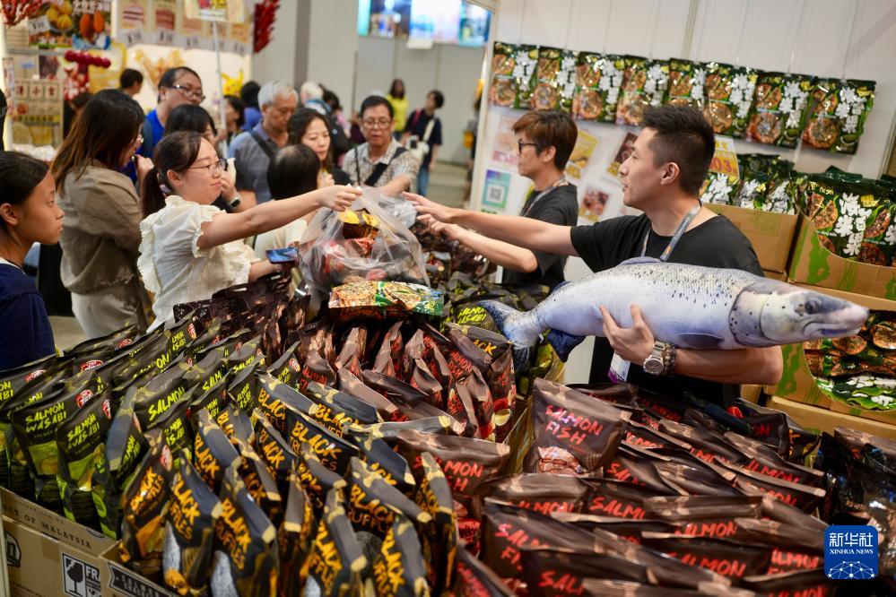 日本水果、西班牙火腿、南非咖啡……走進(jìn)本屆美食博覽現(xiàn)場,環(huán)球美食琳瑯滿目。盡管香港天文臺當(dāng)日上午發(fā)出黑色暴雨警告信號,美食博覽延遲至下午1時許才開始,但參觀者熱情不減。不少人更是有備而來,帶上手推車、拉桿箱裝載“戰(zhàn)利品”。