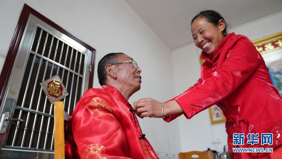 即將拍照的劉仁香替丈夫賴際林整理衣服(1月22日攝)。