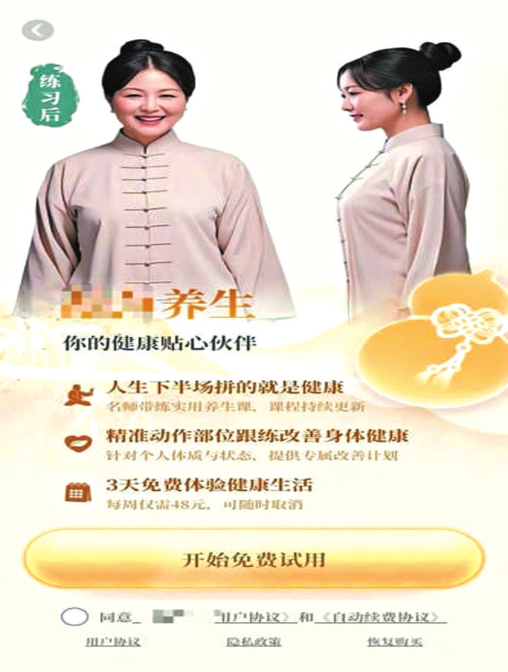 還有些App則更加離譜,下載完成后,點進(jìn)去的第一步就是要購買會員,之后才能正常使用。但在購買流程上,平臺卻耍起了花招。比如一款提供“養(yǎng)生指導(dǎo)服務(wù)”的App,頁面上會有一個大大的按鈕,寫著“開始免費試用”。但在按鈕的旁邊,卻有一行非常不起眼的小字:“每周僅需48元,可隨時取消。”而一旦用戶點擊開始試用,系統(tǒng)就會跳轉(zhuǎn)到自動續(xù)費的開通界面。如果是辨別能力差的老人,可能還以為是在填寫什么注冊信息。