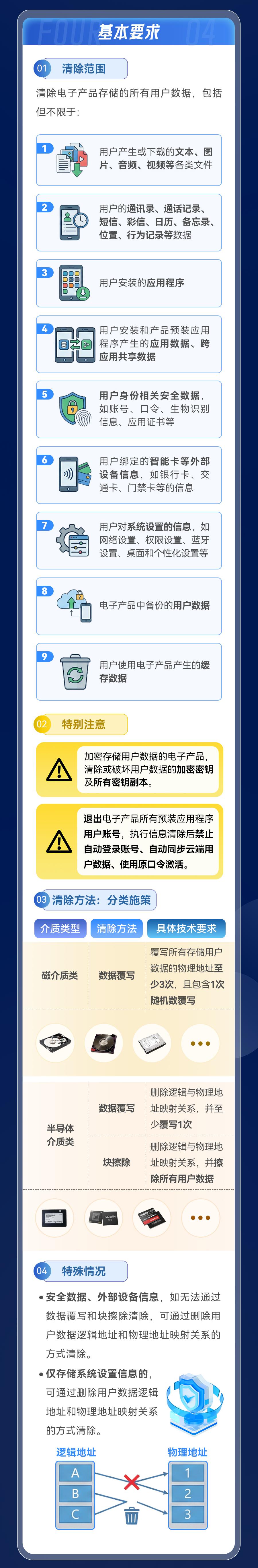 這項強制性國家標(biāo)準(zhǔn)的適用范圍涵蓋了在我國境內(nèi)生產(chǎn)、銷售的各類具有非易失性存儲介質(zhì)的電子產(chǎn)品,包括手機、平板電腦、筆記本電腦、臺式計算機,以及智能穿戴設(shè)備、辦公設(shè)備等。其約束對象既包括電子產(chǎn)品制造商、技術(shù)服務(wù)提供方,也包括二手電子產(chǎn)品回收經(jīng)營者。