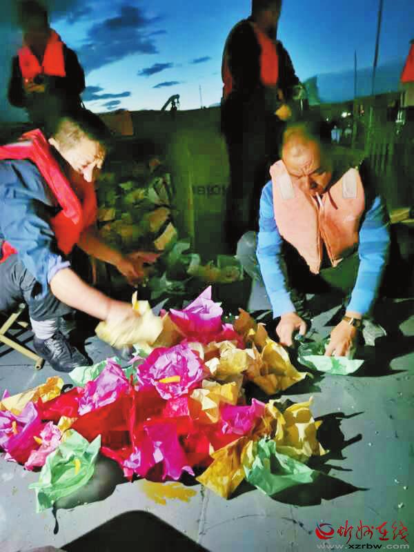 一盞盞花燈放入河中。色彩艷麗的河燈順著黃河主航道向前漂移,燈點(diǎn)綴河,河簇?fù)頍?,無比壯觀。從早先放365盞燈,到現(xiàn)在的3650盞燈,場面更加宏大輝煌。