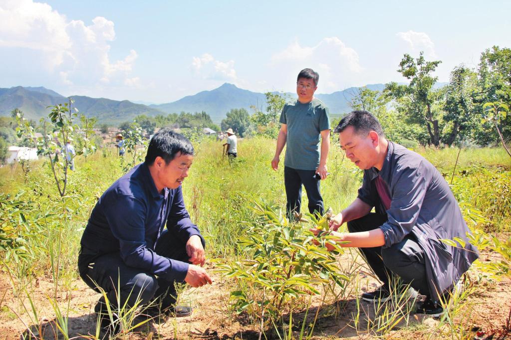 深秋季節(jié),由山西交控集團(tuán)駐五臺縣東雷鄉(xiāng)孟家坪村扶貧工作隊(duì)幫扶種植的480畝油用牡丹還在茁壯生長。41戶入社脫貧戶依靠五臺農(nóng)商銀行金融扶貧的優(yōu)惠政策投資種植。到5年收獲期,年可創(chuàng)產(chǎn)值96萬元,戶均收入2.3萬元。圖為工作隊(duì)員在察看油用牡丹長勢。 俊賢 先良 攝