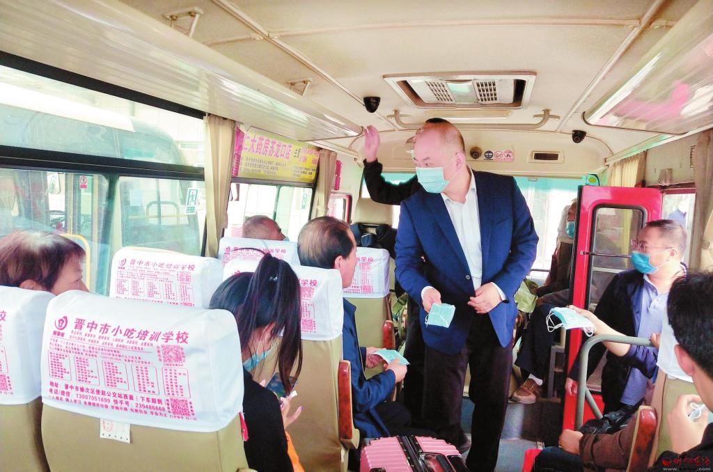原平市交通運(yùn)輸局加強(qiáng)對交通運(yùn)輸企業(yè)、“兩客一危一貨”、旅游包車、網(wǎng)絡(luò)包車和重點(diǎn)路段的監(jiān)督檢查,嚴(yán)厲打擊“三超一疲勞”、非法載客、超員超限、疲勞駕駛和違規(guī)冒險(xiǎn)行車等違法違規(guī)行為。在抓安全的同時(shí),將疫情防控常態(tài)化,強(qiáng)調(diào)汽車站工作人員必須做好登記工作,督促乘客佩戴口罩。圖為工作人員在客車上為旅客發(fā)放口罩。( 劉建春 攝)