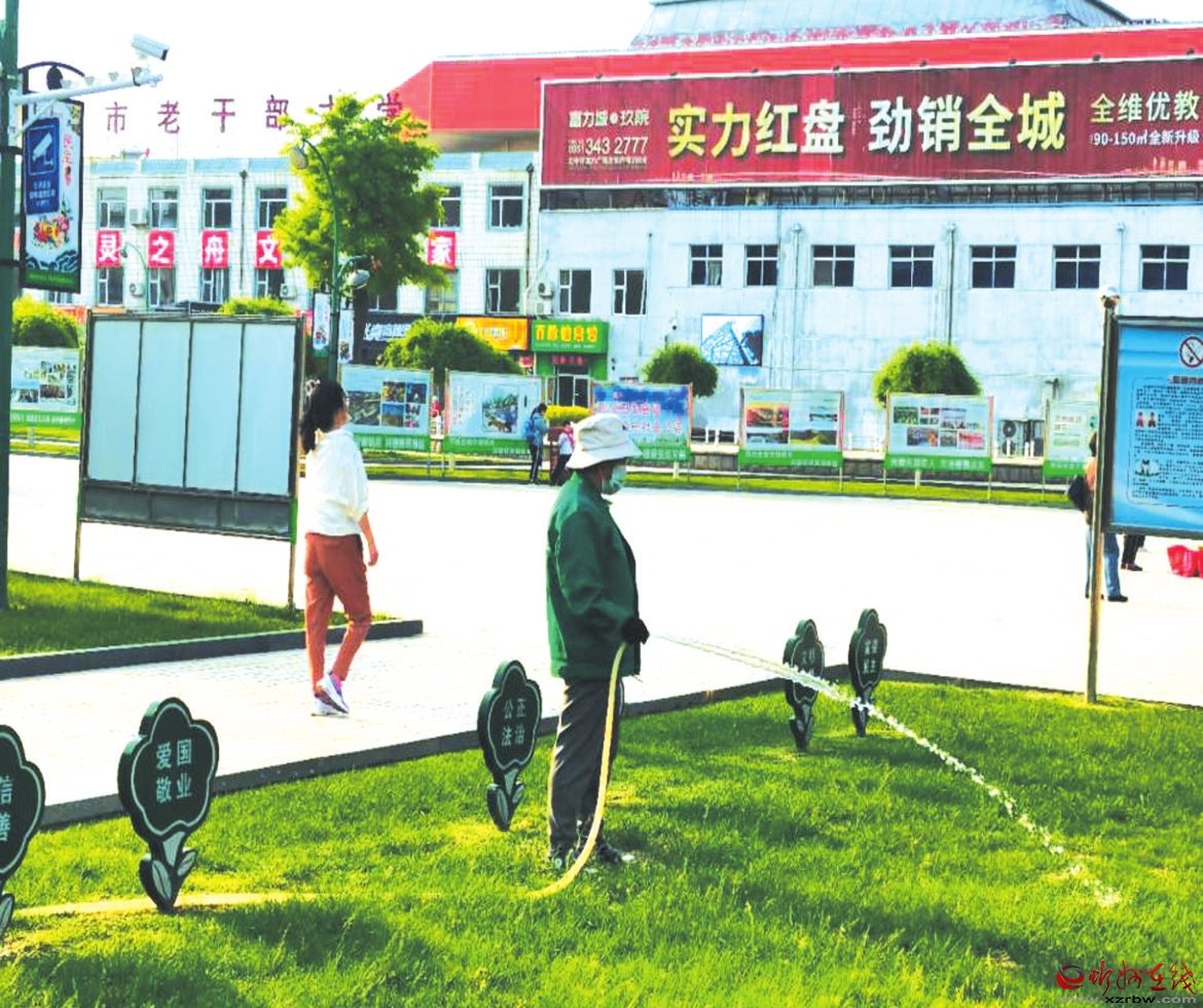 近日,市園林服務中心工作人員對我市城區(qū)體育廣場的綠化帶進行澆水。近期,該中心加強對城區(qū)廣場綠地樹木的修剪、澆水、維護,確保綠化苗木健康生長,助力綠色忻州的建設。 (實習生 許寧寧 攝)