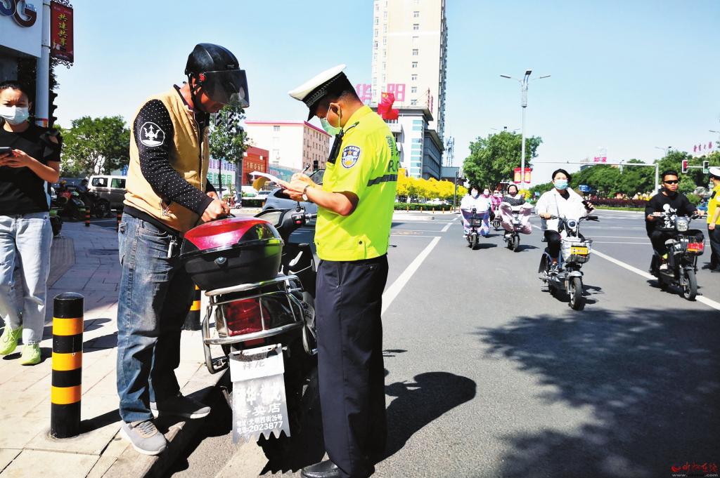 個別市民為了搶幾十秒時間,少走幾百米路,騎電動車闖紅燈、逆行,結果收到交警的罰單。5月27日,在城區(qū)建設路與長征街路口,執(zhí)勤交警一邊開罰單,一邊苦口婆心地勸說交通違法者:“為了自己和他人的安全,一定要遵守交通法規(guī),摒棄交通陋習,遠離交通事故?!保ㄓ浾?張劍雄 攝)