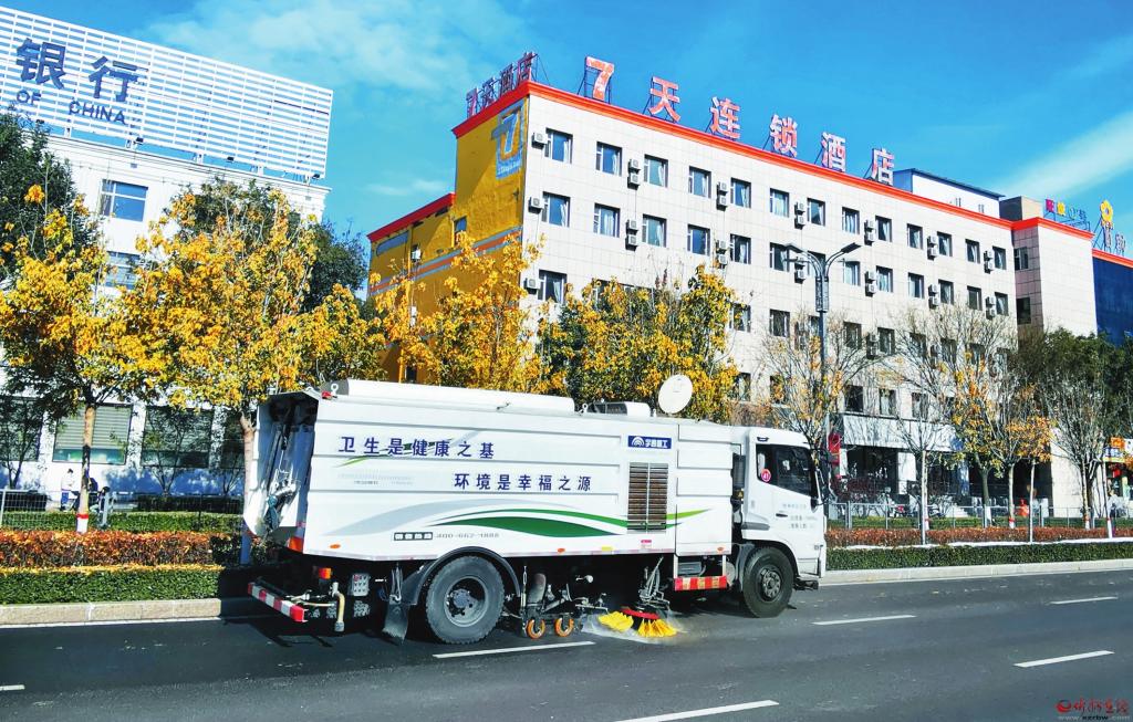 11月10日,高效的環(huán)衛(wèi)洗掃車(chē)正在對(duì)路面進(jìn)行清洗作業(yè)。 (