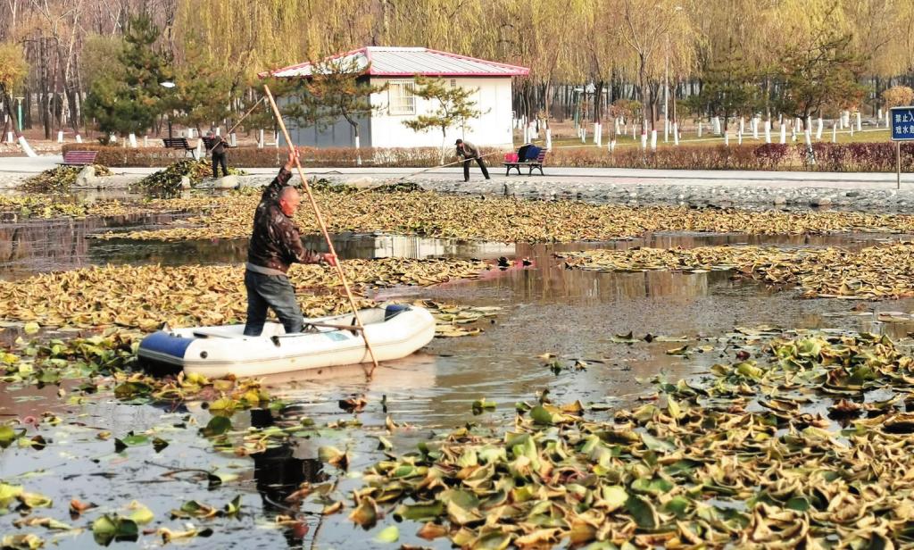 近日,五臺縣園林工人在濕地公園打撈水面上的垃圾和落葉。入冬以來,天氣漸冷,葉落花謝,五臺縣適時啟動水面清潔工作,打造凈水環(huán)境。(