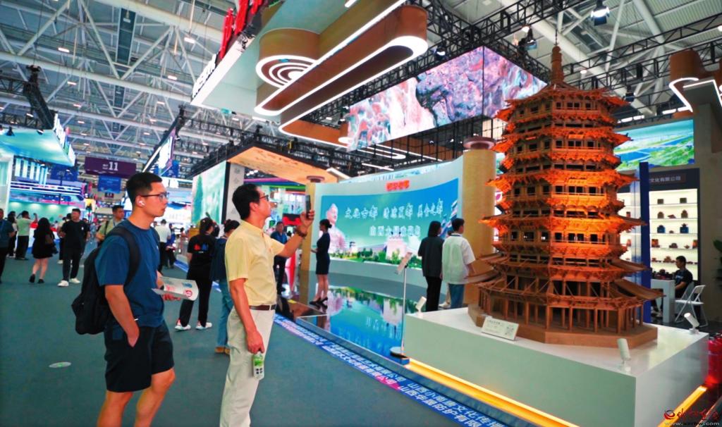 山西晟龍木雕模型藝術(shù)有限公司制作的應(yīng)縣木塔模型一亮相,便吸引了眾多觀展游客的目光。精美絕倫的造型引得人們嘖嘖稱奇,紛紛拿出手機(jī)拍照記錄分享。該模型高約3米,最大直徑1.9米,通過20∶1的比例微縮打造,復(fù)刻了應(yīng)縣木塔的榫卯結(jié)構(gòu),其內(nèi)部樓梯扶手清晰可見,門窗都能打開。“我們的這件展品,是由二十多個(gè)師傅經(jīng)過半年多的時(shí)間完成的。這次為了來深圳參展,我們專門把它從定襄裝運(yùn)發(fā)車,用了整整兩天半的時(shí)間才送到,跨越了將近兩千公里?!痹摴究偨?jīng)理張艷峰告訴記者。