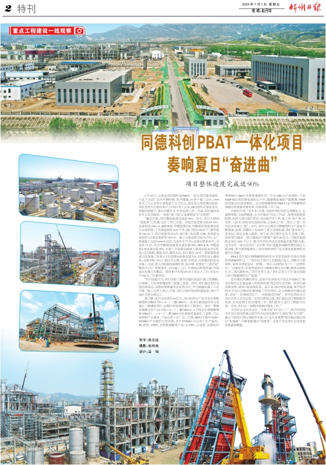 6月25日,記者走進同德科創(chuàng)PBAT一體化項目建設(shè)現(xiàn)場,只見千余畝廠區(qū)內(nèi)車輛穿梭、機聲隆隆,30多個施工點內(nèi),1800多名工人正有條不紊地進行交叉作業(yè),到處是火熱的建設(shè)場景。項目負責(zé)人許新田表示,自項目開工以來,建設(shè)團隊在保證安全、質(zhì)量的前提下,緊扣關(guān)鍵節(jié)點、科學(xué)安排工序。當(dāng)前,項目建設(shè)各環(huán)節(jié)正有序推進,一張張“施工圖”正逐漸轉(zhuǎn)變?yōu)椤皩嵕皥D”。