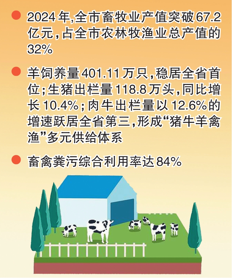 2024年,我市畜牧業(yè)產(chǎn)值突破67.2億元,占全市農(nóng)林牧漁業(yè)總產(chǎn)值的32%;羊飼養(yǎng)量以401.11萬只的規(guī)模穩(wěn)居山西省首位;畜禽糞污綜合利用率達84%……一組組數(shù)據(jù)背后,正是這座北方畜牧強市以“穩(wěn)產(chǎn)保供”筑牢產(chǎn)業(yè)基底、以“全鏈升級”助力鄉(xiāng)村振興的生動實踐。