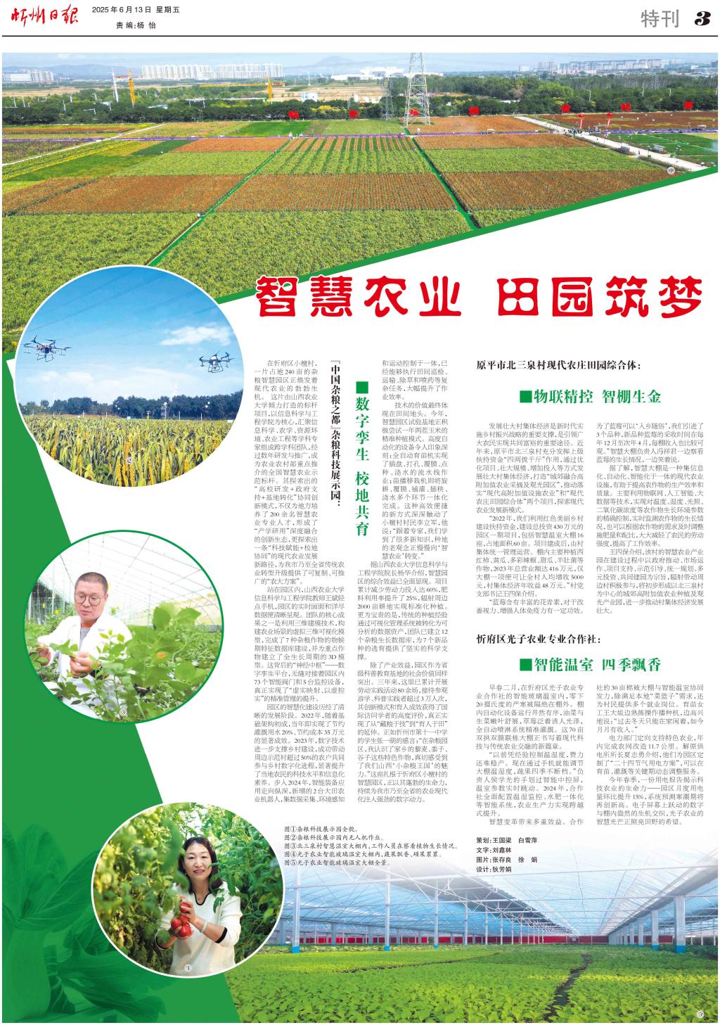 “中國雜糧之都”雜糧科技展示園: ■數(shù)字孿生校地共育 在忻府區(qū)小檀村,一片占地240畝的雜糧智慧園區(qū)正煥發(fā)著現(xiàn)代農(nóng)業(yè)的勃勃生機(jī)。這片由山西農(nóng)業(yè)大學(xué)傾力打造的標(biāo)桿項目,以信息科學(xué)與工程學(xué)院為核心,匯聚信息科學(xué)、農(nóng)學(xué)、資源環(huán)境、農(nóng)業(yè)工程等學(xué)科專家組成跨學(xué)科團(tuán)隊,經(jīng)過數(shù)年研發(fā)與推廣,成為農(nóng)業(yè)農(nóng)村部重點(diǎn)推介的全國智慧農(nóng)業(yè)示范標(biāo)桿。其探索出的“高校研發(fā)+政府支持+基地轉(zhuǎn)化”協(xié)同創(chuàng)新模式,不僅為地方培養(yǎng)了200余名智慧農(nóng)業(yè)專業(yè)人才,形成了“產(chǎn)學(xué)研用”深度融合的創(chuàng)新生態(tài),更探索出一條“科技賦能+校地協(xié)同”的現(xiàn)代農(nóng)業(yè)發(fā)展新路徑,為我市乃至全省傳統(tǒng)農(nóng)業(yè)轉(zhuǎn)型升級提供了可復(fù)制、可推廣的“農(nóng)大方案”。 站在園區(qū)內(nèi),山西農(nóng)業(yè)大學(xué)信息科學(xué)與工程學(xué)院教師王斌輕點(diǎn)手機(jī),園區(qū)的實(shí)時畫面和詳盡數(shù)據(jù)便清晰呈現(xiàn)。團(tuán)隊的核心成果之一是利用三維建模技術(shù),構(gòu)建農(nóng)業(yè)場景的虛擬三維可視化模型,完成了7種雜糧作物的物候期特征數(shù)據(jù)庫建設(shè),并為重點(diǎn)作物建立了全生長周期的3D模型。這背后的“神經(jīng)中樞”——數(shù)字孿生平臺,無縫對接著園區(qū)內(nèi)73個智能閥門和5臺監(jiān)控設(shè)備,真正實(shí)現(xiàn)了“虛實(shí)映射、以虛控實(shí)”的精準(zhǔn)管理的提升。 園區(qū)的智慧化建設(shè)歷經(jīng)了清晰的發(fā)展階段。2022年,隨著基礎(chǔ)架構(gòu)初成,當(dāng)年即實(shí)現(xiàn)了節(jié)約灌溉用水20%、節(jié)約成本35萬元的顯著成效。2023年,數(shù)字技術(shù)進(jìn)一步支撐鄉(xiāng)村建設(shè),成功帶動周邊示范村超過50%的農(nóng)戶共同參與鄉(xiāng)村數(shù)字化進(jìn)程,顯著提升了當(dāng)?shù)剞r(nóng)民的科技水平和信息化素養(yǎng)。步入2024年,智能裝備應(yīng)用走向縱深,新增的2臺大田農(nóng)業(yè)機(jī)器人,集數(shù)據(jù)采集、環(huán)境感知 和運(yùn)動控制于一體,已經(jīng)能夠執(zhí)行田間巡檢、運(yùn)輸、除草和噴藥等復(fù)雜任務(wù),大幅提升了作業(yè)效率。 技術(shù)的價值最終體現(xiàn)在田間地頭。今年,智慧園區(qū)試驗(yàn)基地正積極嘗試一年兩茬玉米的精準(zhǔn)種植模式。高度自動化的設(shè)備令人印象深刻:全自動育苗機(jī)實(shí)現(xiàn)了插盤、打孔、覆膜、點(diǎn)種、澆水的流水線作業(yè);苗播移栽機(jī)則將旋耕、覆膜、鋪灌、插秧、澆水多個環(huán)節(jié)一體化完成。這種高效便捷的新方式深深觸動了小檀村村民李立軍,他說:“跟著專家,我們學(xué)到了很多新知識,種地的老觀念正慢慢向‘智慧農(nóng)業(yè)’轉(zhuǎn)變?!?/p> 據(jù)山西農(nóng)業(yè)大學(xué)信息科學(xué)與工程學(xué)院院長楊華介紹,智慧園區(qū)的綜合效益已全面顯現(xiàn)。項目累計減少勞動力投入達(dá)60%,肥料利用率提升了25%,輻射周邊2000畝耕地實(shí)現(xiàn)標(biāo)準(zhǔn)化種植。更為寶貴的是,傳統(tǒng)的種植經(jīng)驗(yàn)通過可視化管理系統(tǒng)被轉(zhuǎn)化為可分析的數(shù)據(jù)資產(chǎn),團(tuán)隊已建立12個雜糧生長數(shù)據(jù)庫,為7個新品種的選育提供了堅實(shí)的科學(xué)支撐。 除了產(chǎn)業(yè)效益,園區(qū)作為省級科普教育基地的社會價值同樣突出。三年來,這里已累計開展勞動實(shí)踐活動80余場,接待參觀游學(xué)、科普實(shí)踐者超過3萬人次,其創(chuàng)新模式和育人成效獲得了國際訪問學(xué)者的高度評價,真正實(shí)現(xiàn)了從“藏糧于技”到“育人于田”的延伸。正如忻州市第十一中學(xué)的學(xué)生張一萌的感言:“在雜糧園區(qū),我認(rèn)識了家鄉(xiāng)的藜麥、黍子、谷子這些特色作物,真切感受到了我們山西‘小雜糧王國’的魅力?!边@座扎根于忻府區(qū)小檀村的智慧園區(qū),正以其蓬勃的生命力,持續(xù)為我市乃至全省的農(nóng)業(yè)現(xiàn)代化注入強(qiáng)勁的數(shù)字動力。 原平市北三泉村現(xiàn)代農(nóng)莊田園綜合體: ■物聯(lián)精控智棚生金 發(fā)展壯大村集體經(jīng)濟(jì)是新時代實(shí)施鄉(xiāng)村振興戰(zhàn)略的重要支撐,是引領(lǐng)廣大農(nóng)民實(shí)現(xiàn)共同富裕的重要途徑。近年來,原平市北三泉村充分發(fā)揮上級扶持資金“四兩撥千斤”作用,通過優(yōu)化項目、壯大規(guī)模、增加投入等方式發(fā)展壯大村集體經(jīng)濟(jì),打造“城郊融合高附加值農(nóng)業(yè)采摘及觀光園區(qū)”,推動落實(shí)“現(xiàn)代高附加值設(shè)施農(nóng)業(yè)”和“現(xiàn)代農(nóng)莊田園綜合體”兩個項目,探索現(xiàn)代農(nóng)業(yè)發(fā)展新模式。 “2022年,我們利用紅色美麗鄉(xiāng)村建設(shè)扶持資金,建設(shè)總投資430萬元的園區(qū)一期項目,包括智慧溫室大棚16座,占地面積60畝。項目建成后,由村集體統(tǒng)一管理運(yùn)營。棚內(nèi)主要種植西紅柿、黃瓜、多彩辣椒、甜瓜、羊肚菌等作物,2023年總營