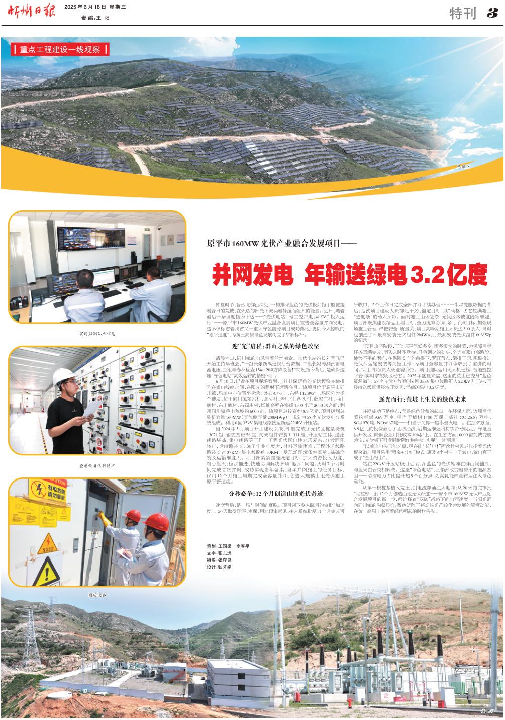 “項(xiàng)目攻堅(jiān)階段,正值原平氣候多變,雨多霧大的時(shí)節(jié),為保障目標(biāo)任務(wù)圓滿完成,團(tuán)隊(duì)以時(shí)不我待、只爭(zhēng)朝夕的勁頭,全力克服山高路險(xiǎn)、地勢(shì)不平的困難,在保障安全的前提下,緊盯節(jié)點(diǎn),倒排工期,積極推進(jìn)光伏片運(yùn)輸安裝等關(guān)鍵工作,為項(xiàng)目全容量并網(wǎng)爭(zhēng)取到了寶貴的時(shí)間?!表?xiàng)目部負(fù)責(zé)人楊亞賽介紹。項(xiàng)目團(tuán)隊(duì)運(yùn)用無人機(jī)巡檢、智能監(jiān)控平臺(tái),實(shí)時(shí)掌控場(chǎng)區(qū)動(dòng)態(tài)。2025年盛夏來臨,這里的荒山已變身“藍(lán)色能源?!?。58個(gè)光伏方陣通過6回35kV集電線路匯入220kV升壓站,再經(jīng)輸送線直供經(jīng)濟(jì)開發(fā)區(qū),年輸送綠電3.2億度。