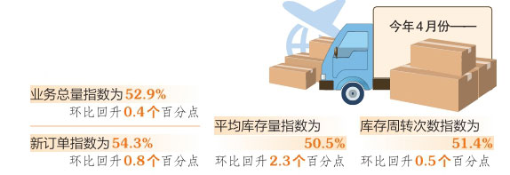 業(yè)務(wù)總量指數(shù)與新訂單指數(shù)雙回升。4月份,業(yè)務(wù)總量指數(shù)為52.9%,環(huán)比回升0.4個(gè)百分點(diǎn);新訂單指數(shù)為54.3%,環(huán)比回升0.8個(gè)百分點(diǎn)。顯示出物流行業(yè)規(guī)模在擴(kuò)張區(qū)間,業(yè)務(wù)總量指數(shù)、新訂單指數(shù)均保持增長態(tài)勢,經(jīng)濟(jì)延續(xù)回升態(tài)勢不變,物流市場需求繼續(xù)釋放。