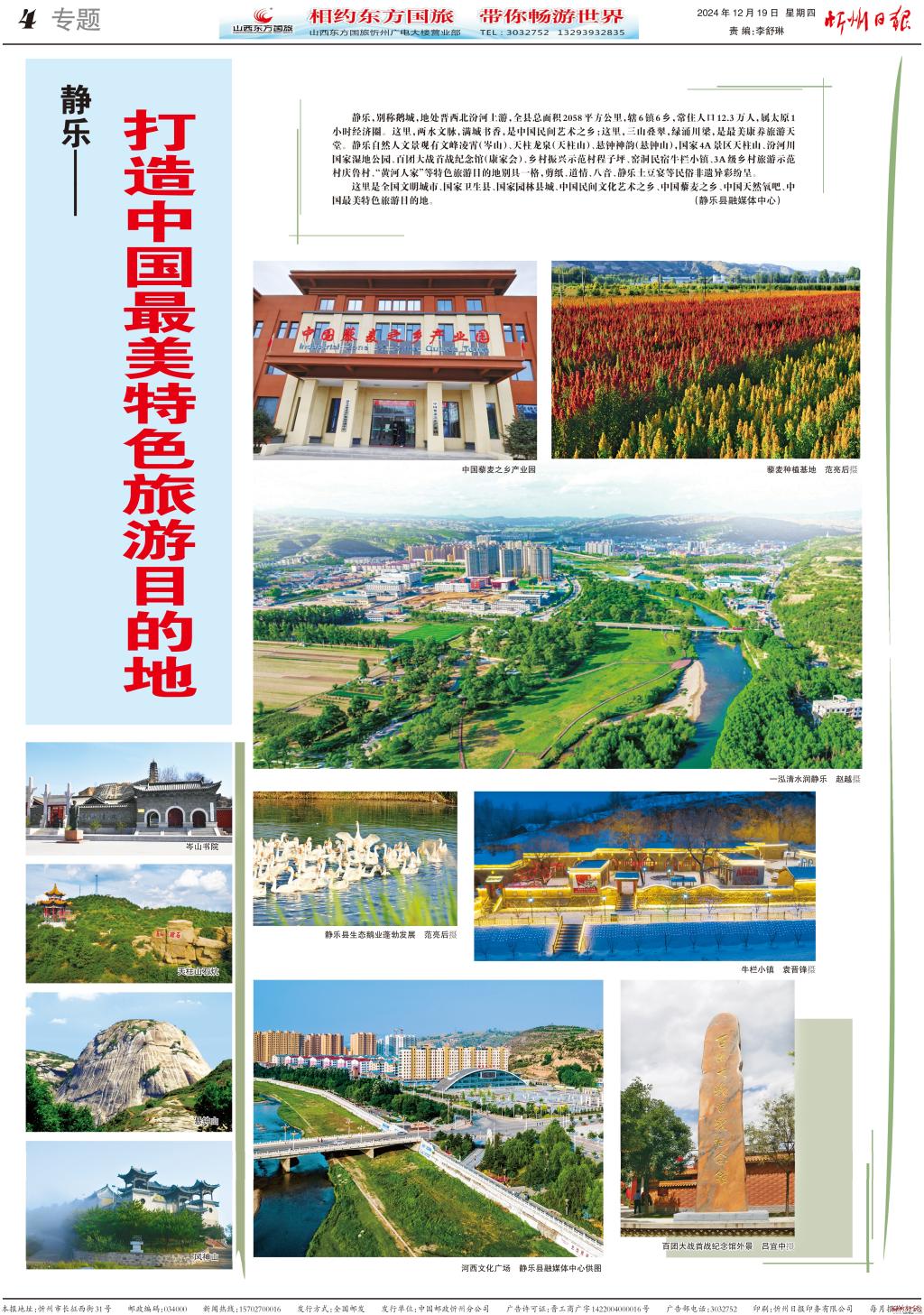 靜樂,別稱鵝城,地處晉西北汾河上游,全縣總面積2058平方公里,轄6鎮(zhèn)6鄉(xiāng),常住人口12.3萬人,屬太原1小時(shí)經(jīng)濟(jì)圈。這里,兩水文脈,滿城書香,是中國民間藝術(shù)之鄉(xiāng);這里,三山疊翠,綠涌川梁,是最美康養(yǎng)旅游天堂。靜樂自然人文景觀有文峰凌霄(岑山)、天柱龍泉(天柱山)、懸鐘神韻(懸鐘山),國家4A景區(qū)天柱山、汾河川國家濕地公園、百團(tuán)大戰(zhàn)首戰(zhàn)紀(jì)念館(康家會(huì))、鄉(xiāng)村振興示范村程子坪、窯洞民宿牛欄小鎮(zhèn)、3A級(jí)鄉(xiāng)村旅游示范村慶魯村、“黃河人家”等特色旅游目的地別具一格,剪紙、道情、八音、靜樂土豆宴等民俗非遺異彩紛呈。