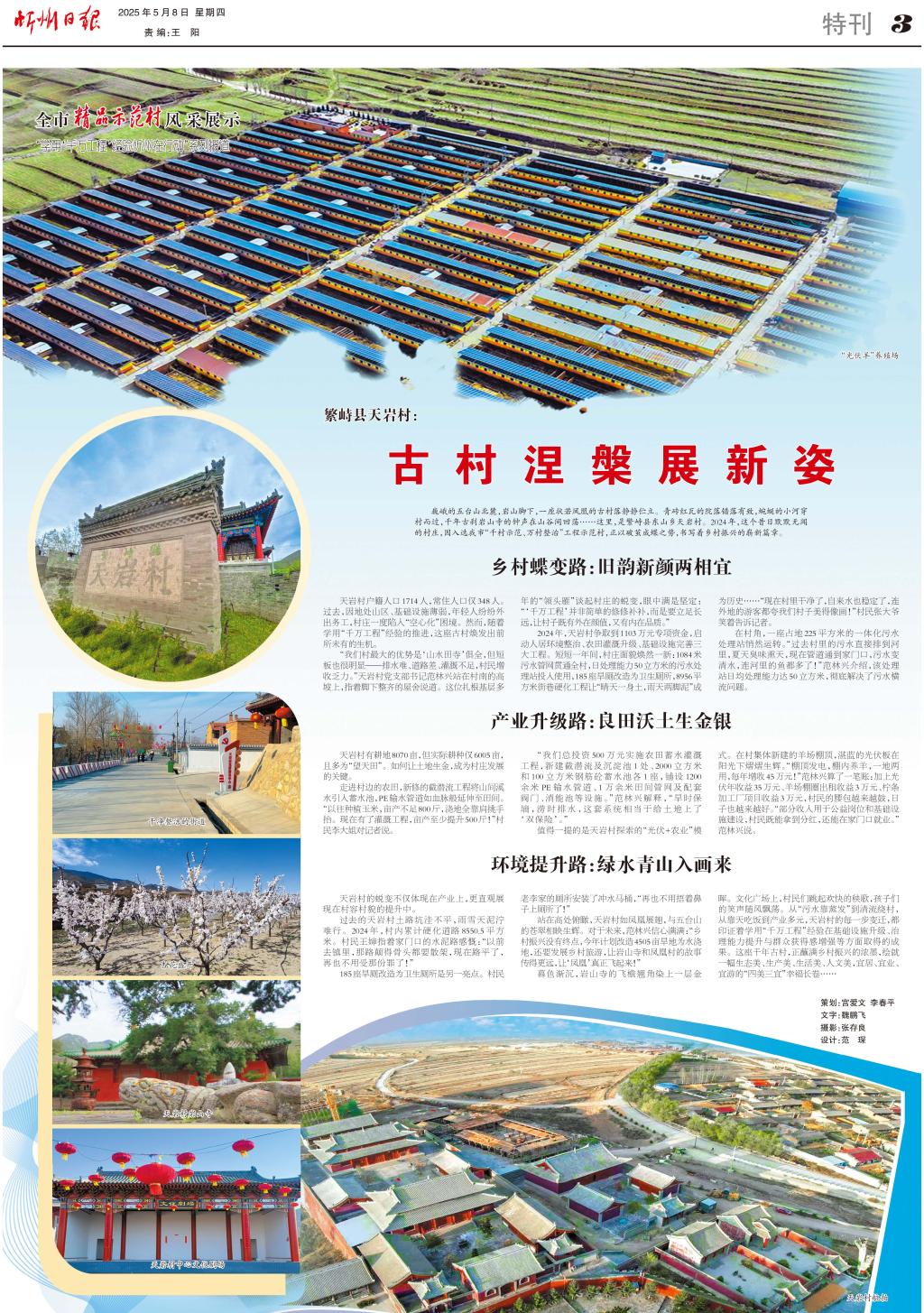 巍峨的五臺山北麓,巖山腳下,一座狀若鳳凰的古村落靜靜佇立。青磚紅瓦的院落錯落有致,蜿蜒的小河穿村而過,千年古剎巖山寺的鐘聲在山谷間回蕩……這里,是繁峙縣東山鄉(xiāng)天巖村。2024年,這個昔日默默無聞的村莊,因入選我市“千村示范、萬村整治”工程示范村,正以破繭成蝶之勢,書寫著鄉(xiāng)村振興的嶄新篇章。