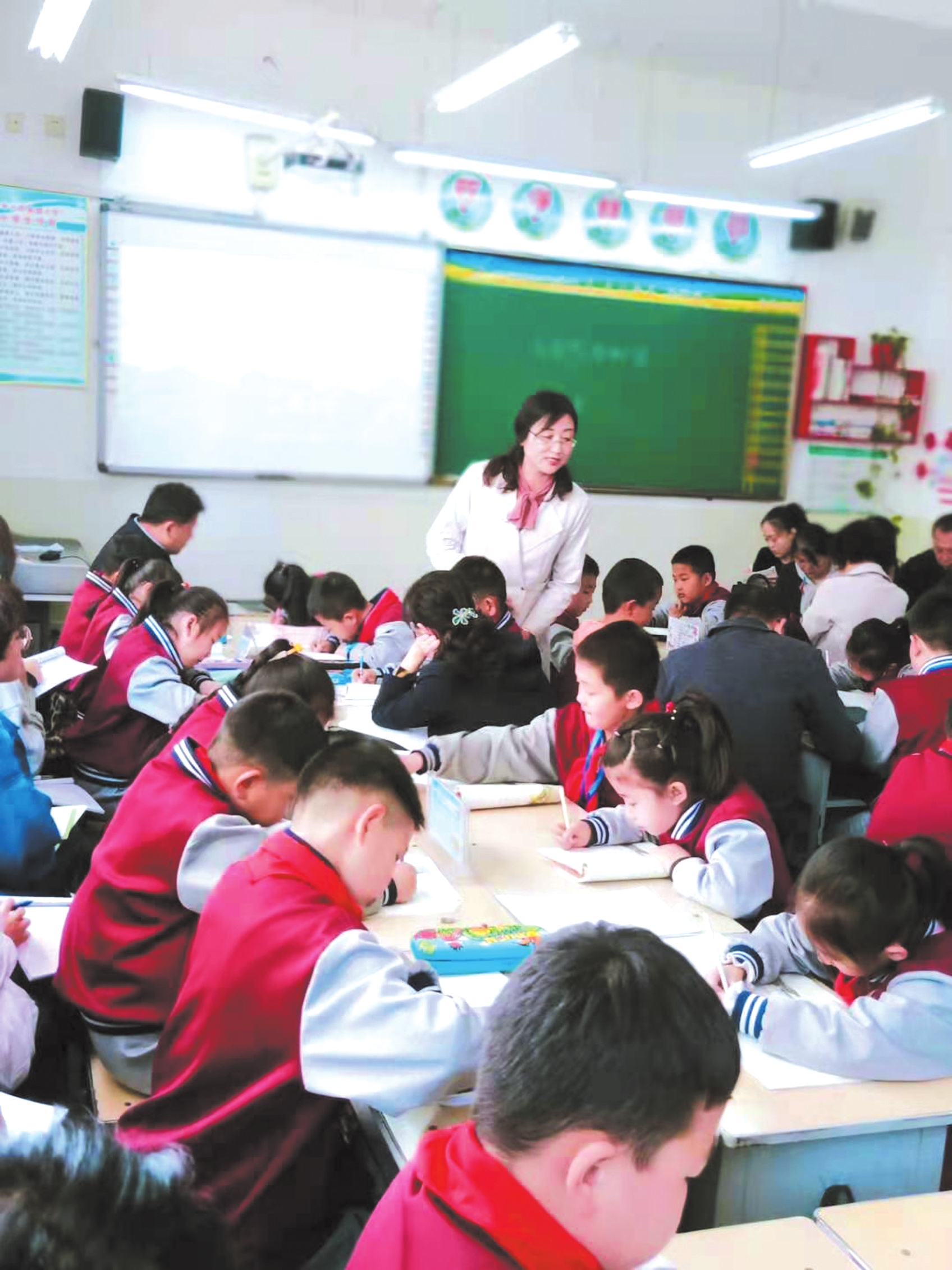 在學(xué)校的公開課,授課老師與學(xué)生及聽課的家長交流互動。