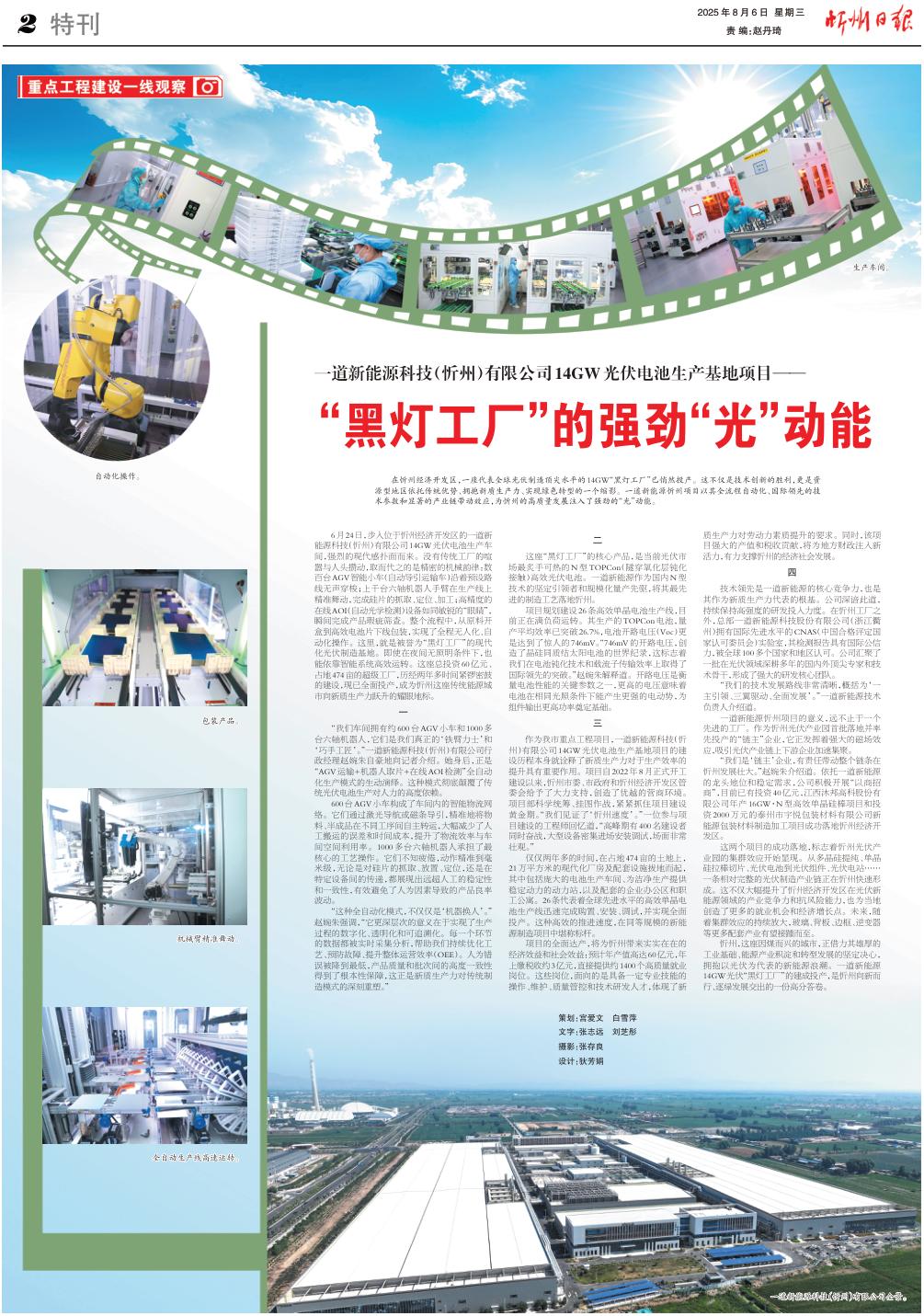 6月24日,步入位于忻州經(jīng)濟開發(fā)區(qū)的一道新能源科技(忻州)有限公司14GW光伏電池生產(chǎn)車間,強烈的現(xiàn)代感撲面而來。沒有傳統(tǒng)工廠的喧囂與人頭攢動,取而代之的是精密的機械韻律:數(shù)百臺AGV智能小車(自動導引運輸車)沿著預設路線無聲穿梭;上千臺六軸機器人手臂在生產(chǎn)線上精準舞動,完成硅片的抓取、定位、加工;高精度的在線AOI(自動光學檢測)設備如同敏銳的“眼睛”,瞬間完成產(chǎn)品瑕疵篩查。整個流程中,從原料開盒到高效電池片下線包裝,實現(xiàn)了全程無人化、自動化操作。這里,就是被譽為“黑燈工廠”的現(xiàn)代化光伏制造基地。即使在夜間無照明條件下,也能依靠智能系統(tǒng)高效運轉。這座總投資60億元、占地474畝的超級工廠,歷經(jīng)兩年多時間緊鑼密鼓的建設,現(xiàn)已全面投產(chǎn),成為忻州這座傳統(tǒng)能源城市向新質生產(chǎn)力躍升的耀眼地標。