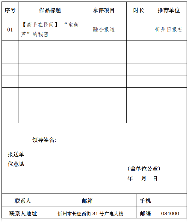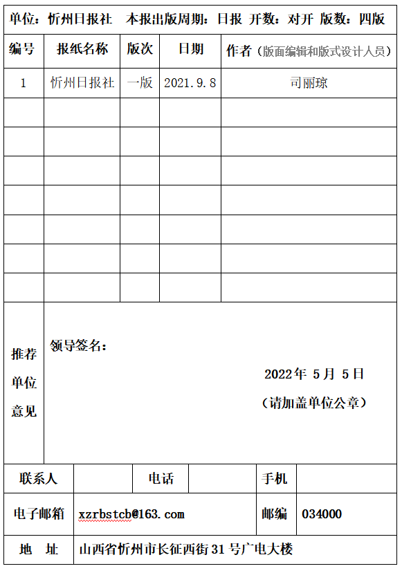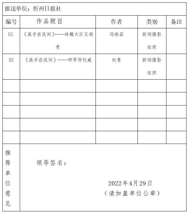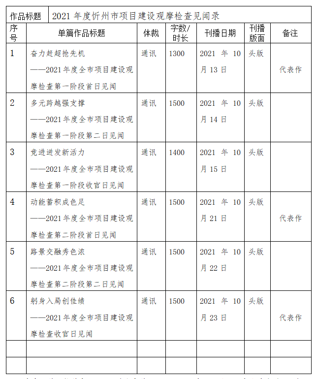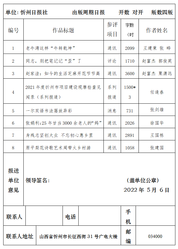 經(jīng)忻州日報(bào)社編委會(huì)研究決定,以下作品擬推薦申評(píng)第三十一屆山西新聞獎(jiǎng),現(xiàn)予以公示。有反對意見者,請將反對意見書面報(bào)至統(tǒng)籌部。