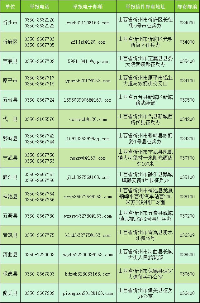 為認(rèn)真貫徹落實(shí)上級關(guān)于廉潔征兵的政策規(guī)定,維護(hù)廣大應(yīng)征青年的合法權(quán)益,嚴(yán)明征兵紀(jì)律,拓寬監(jiān)督渠道,營造風(fēng)清氣正的征兵環(huán)境,現(xiàn)將2025年忻州市級廉潔征兵監(jiān)督員和市縣兩級舉報(bào)電話、郵箱等信息予以公示,歡迎全社會對征兵工作進(jìn)行監(jiān)督。