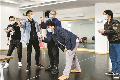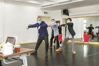 雖然疫情正在向好,但防控的弦還不能就此放松下來。整個藝苑大樓彌漫著消毒水的味道,演員們都戴著口罩,分散在排練廳、會議室、演員隊等各個角落進(jìn)行排練。
