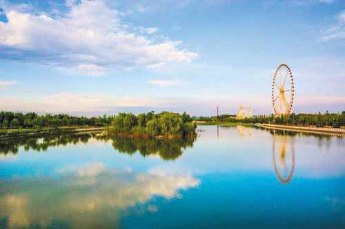 沿著河岸邊的石板路緩緩向西前行,手中撫過岸邊的花崗石欄桿,偶有微風拂面,帶起耳畔凌亂的發(fā)絲,讓人頓覺神清氣爽,想要沉醉在眼前的迷人風光中。這時,不遠處忽然傳來人們的歡呼聲和尖叫聲,我上前一看,原來已經(jīng)走到了云中河游樂園。游樂園里的娛樂項目多樣,其中最醒目的便是那高達88米、修建時高度居山西第一的摩天輪,伴隨著悅耳的歌謠,摩天輪緩緩地轉(zhuǎn)動著,帶著人們對浪漫的遐想。