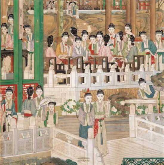 畫面右側(cè)的建筑,最前景的蘅蕪院中,庭院外蕉葉舒展,拳石林立,雕花架上擺放著盆蘭。明間當(dāng)中設(shè)一紫檀條案,背后則又有山水字畫折屏;左右梢間兩側(cè)幾架列書函卷冊,上置古琴、錦盒等物;室內(nèi)青銅鼎、觚、汝窯瓷瓶等古玩點(diǎn)綴其間。在三間的四壁罩頂上皆掛著書法橫幅,飽含書卷氣息。寶玉與眾姊妹圍坐在案邊,正在觀看一伏案提筆、從容書寫的女子,這應(yīng)是黛玉。