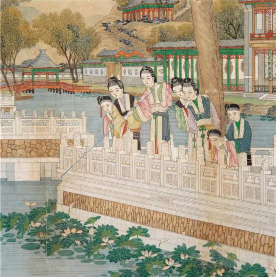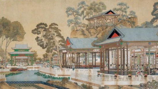 畫面中,曲折縈紆的溪水自蘅蕪院流經(jīng)牡丹亭、凹晶館、蓼風(fēng)軒、秋爽齋等地,最終蜿蜒向畫面遠(yuǎn)方,層層亭臺廊橋,一望無盡。許軍杰認(rèn)為,此繪之溪水應(yīng)為沁芳溪。正如周汝昌先生在《北京大觀園·引言》中評價(jià):“大觀園全部的主脈與‘靈魂’是一條蜿若游龍的‘沁芳溪’。亭、橋、泉、閘,皆以此二字為名,可為明證。一切景觀,依溪為境”,“大觀園的一切池、臺、館、泉、石、林、塘,皆以沁芳溪為大脈絡(luò)而盤旋布置?!眻D中的這曲溪水亦有異曲同工之功能,將兩岸建筑、山石、樹木巧妙地聯(lián)系在一起,使其形成一個(gè)有機(jī)的園林整體。(李君娜)