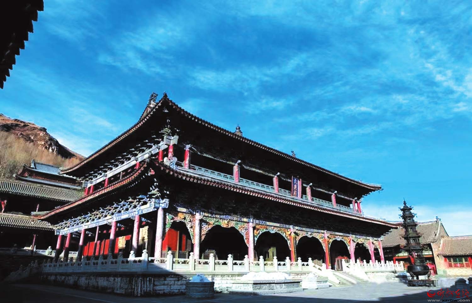 經(jīng)過懸掛著“金閣浮空”匾額的木牌坊,沿著108級漢白玉石臺階拾級而上,山門處沉靜肅穆。放慢腳步,深深呼吸,感受空氣的清新與純凈,感受獨有的靜謐與祥和。走進(jìn)寺內(nèi),仿佛穿越時空,抵達(dá)一個與世隔絕的佛國世界。