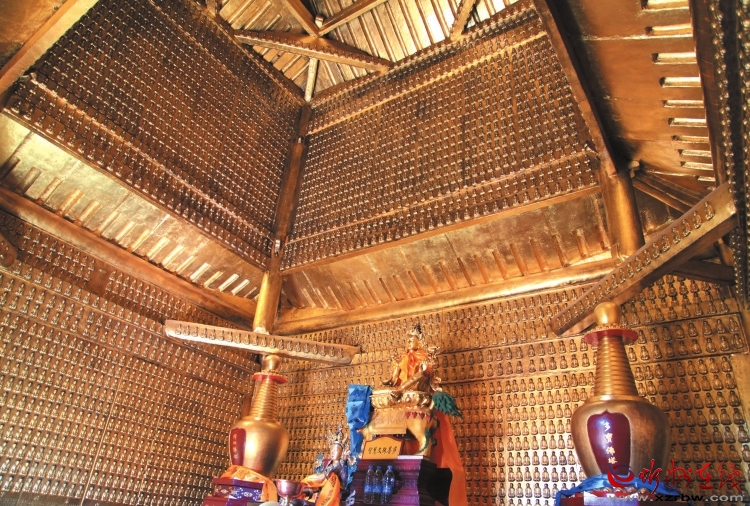 隔扇外壁鑄有36幅花卉圖案,有二龍戲珠、魚躍龍門、犀牛望月、玉兔拜月等,構(gòu)圖清晰,形象生動。殿內(nèi)四壁滿鑄小佛,號稱萬佛,佛像形態(tài)各異,栩栩如生。殿內(nèi)正中供奉著一尊高達1米的銅鑄文殊騎獅像,其鑄藝高超,神態(tài)逼真,體態(tài)閑適,是明代銅鑄佛像之珍品。