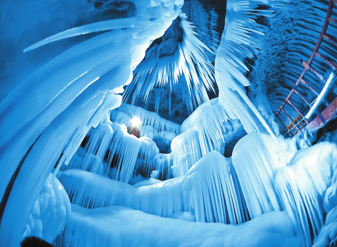 洞窟中,冰柱、冰瀑、冰簾等景觀千姿百態(tài),或玲瓏剔透,或雄偉壯觀,構(gòu)成一個(gè)鬼斧神工的冰雪殿堂,2005年,被評為國家地質(zhì)公園。更為神奇的是,與之僅一嶺之隔的“火焰山”卻地?zé)嵴趄v,常年溫?zé)?。這種極端的自然現(xiàn)象在同一山體并存,堪稱地質(zhì)學(xué)上的奇跡,吸引著無數(shù)科考人員和游客前來探秘。