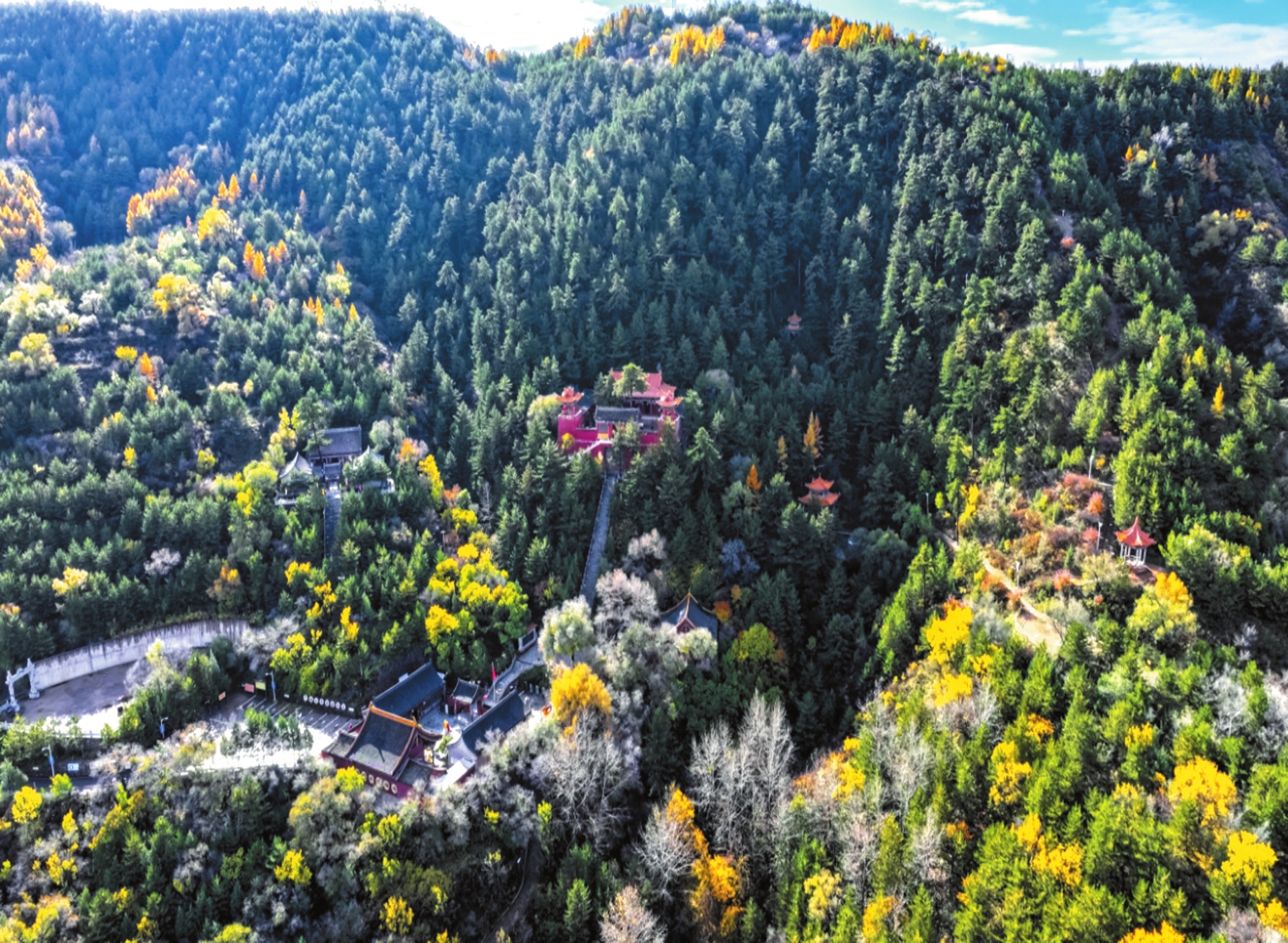 山林間宏大的廟宇建筑群始建于北魏時期,憑借清幽秀麗的自然風光和深厚的文化底蘊,吸引了眾多高僧來此傳經(jīng)布道。隨著佛教文化的發(fā)展,與之相關的建筑藝術、雕塑藝術、壁畫藝術歷代都有發(fā)展,可惜大部分毀于戰(zhàn)火。1992年開始重建,集儒釋道于一體的廟宇群規(guī)模宏大。