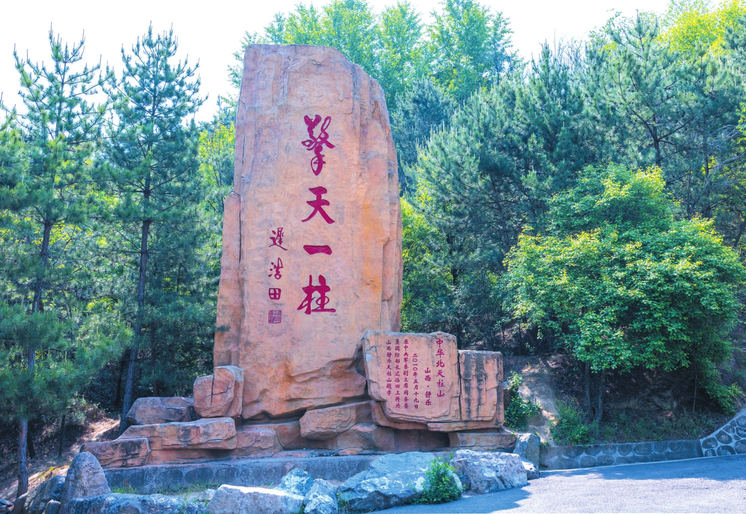山路向南急轉后變得平坦舒緩起來,氣勢恢弘的建筑群呈現(xiàn)在眼前。右邊護坡上,是天柱山的“名人墻”,鑲嵌著靜樂九大名人的肖像,有功蓋千古的賢相,有戰(zhàn)功赫赫的名將,有學識淵博的鴻儒,有英勇無畏的革命者。不遠處,一塊赭色大石莊嚴矗立,上面是中央軍委原副主席遲浩田上將于2010年5月為天柱山的題詞:擎天一柱。將軍蒼勁有力的書法,與山之威武相得益彰。