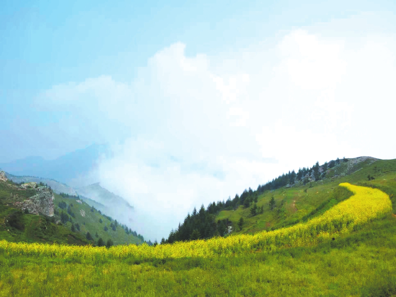 上到山頂,眼前豁然開朗。近處有草坡鋪陳,松樹成林,遠處卻是十萬大山籠罩在濃密的云霧里,白茫茫無邊無際宛如汪洋大海。