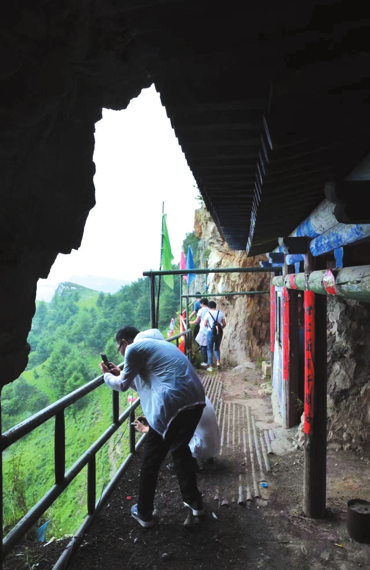 從老君洞主峰下的羊腸小道向前走,可望見峰巒半腰間露出建筑物一角,那便是老君廟了。登臨老君廟,依靠在山的裂縫里開鑿出的一條棧道,一腳一蹬,一步一攀,急不得,快不了,就這樣亦步亦趨才能抵達這座懸在半空的小廟。