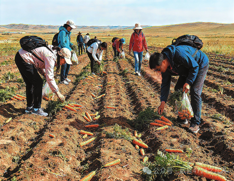 “撿秋”游演繹著“鄉(xiāng)土中國(guó)”的現(xiàn)代篇章。費(fèi)孝通在《鄉(xiāng)土中國(guó)》開篇即言“從基層上看去,中國(guó)社會(huì)是鄉(xiāng)土性的”。這種“鄉(xiāng)土性”的核心是人與土地的深度綁定。農(nóng)民靠土地生存,土地是文化認(rèn)同的根基?!皳烨铩边@種農(nóng)耕活動(dòng),如今以更加鮮活方式延續(xù)下來。對(duì)農(nóng)民而言,土地不僅是謀生手段,更是安身立命的“精神原鄉(xiāng)”。而城市游客的參與則賦予了“撿秋”新的意義。在城市里待久了,就想蹲在田里感受泥土的溫度,游客“撿秋”體驗(yàn)的是“春種秋收”踏實(shí)感。這種體驗(yàn)式參與是現(xiàn)代人對(duì)鄉(xiāng)土文明的“情感反哺”。游客們彎腰的身影既是對(duì)土地的致敬,也是對(duì)“根”的追尋。他們未必真懂農(nóng)事,但通過參與“撿秋”完成了對(duì)鄉(xiāng)土文化的認(rèn)同,被撿起的“果實(shí)”從“生存作物”演變?yōu)椤拔幕浇椤薄.?dāng)前,內(nèi)蒙古各地推出的挖土豆、烤土豆等旅游項(xiàng)目是對(duì)鄉(xiāng)土資源的文化再“編碼”,當(dāng)土豆從田間走向游客的后備箱,“鄉(xiāng)土中國(guó)”便獲得了更加豐富的表達(dá)。