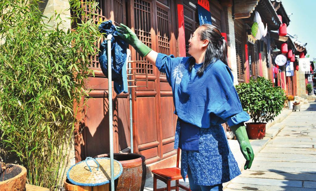 趙慧說,古城文創(chuàng)街的店鋪給了手工藝人更多的可能性和幸福感。以前大多是因?yàn)闊釔?,自己四處找了染材做著玩,身邊的朋友們口口相傳,遇見喜歡的就收走,現(xiàn)在有了古城的平臺(tái),更多的人認(rèn)識(shí)了草木染,更多喜歡傳統(tǒng)文化、講究生活品質(zhì)的朋友們愛上了這樣的作品。趙慧守著小店,染染布、縫縫包、種種花、喝喝茶,把自己的熱愛和鉆研一顏一色染進(jìn)布里,一針一線縫到作品中。通過那些有趣和有創(chuàng)意的作品,她覺得生活更加溫馨了。