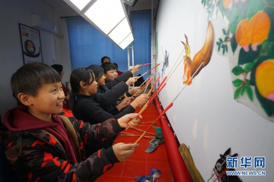 11月24日,河北省沙河市西油村小學學生在練習表演皮影戲。