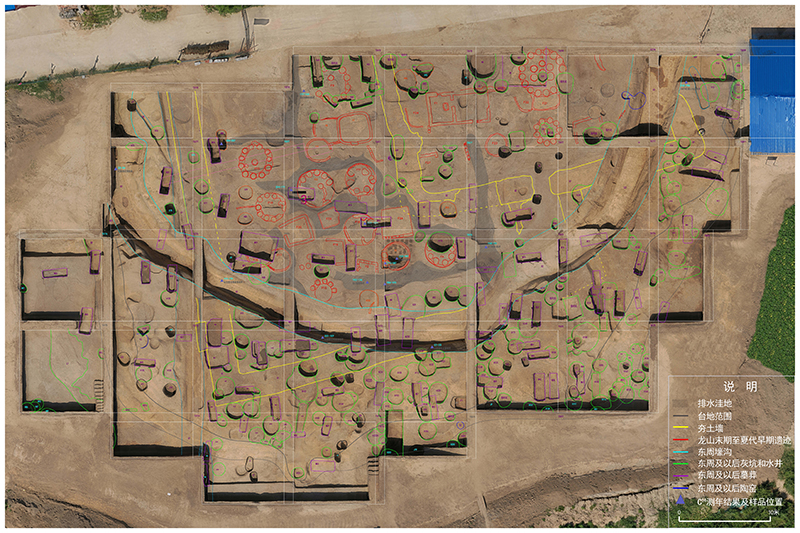 河南周口時(shí)莊遺址發(fā)現(xiàn)一處糧倉倉城,年代距今4000年至3700年,相當(dāng)于文獻(xiàn)記載的夏代早期。城址座落在人工墊筑臺(tái)地上。城址中心發(fā)現(xiàn)一座連間房屋,房屋周圍散布28座倉儲(chǔ)建筑遺跡,堆積中檢測出粟、黍類作物的穎殼,推測應(yīng)為糧倉。