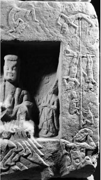 請(qǐng)看下圖。這幅圖是云岡第38窟中的一幅石刻墨線描摹圖,它應(yīng)該叫《橦倒樂伎圖》。圖中的表演與峨口撓閣非常相似,比今天的峨口撓閣更驚險(xiǎn)、更具觀賞性。如果我們把這幅圖和峨口撓閣比較一下,會(huì)清楚地發(fā)現(xiàn),峨口撓閣藝術(shù)歷史久遠(yuǎn)、文化根脈綿長(zhǎng),會(huì)發(fā)現(xiàn)峨口撓閣曾經(jīng)的歷史高度和文化沃土的厚度。